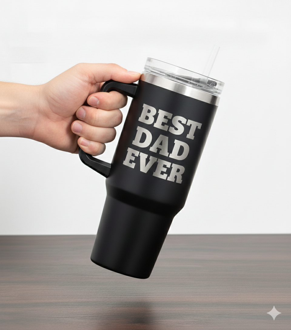 This large, black travel mug is the perfect gift for the “BEST DAD EVER.” It features that great message permanently laser-engraved right onto the side, so it will never fade or peel off. Made from sturdy stainless steel with double-wall vacuum insulation, this tumbler keeps drinks icy cold or steaming hot for hours. It’s designed for convenience, too, with an easy-to-hold handle and a shape that fits into most car cup holders, making it ideal for work, travel, or just relaxing at home.