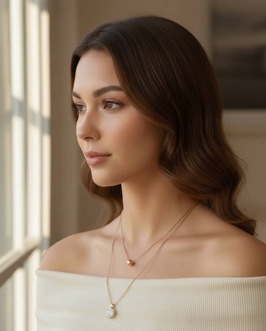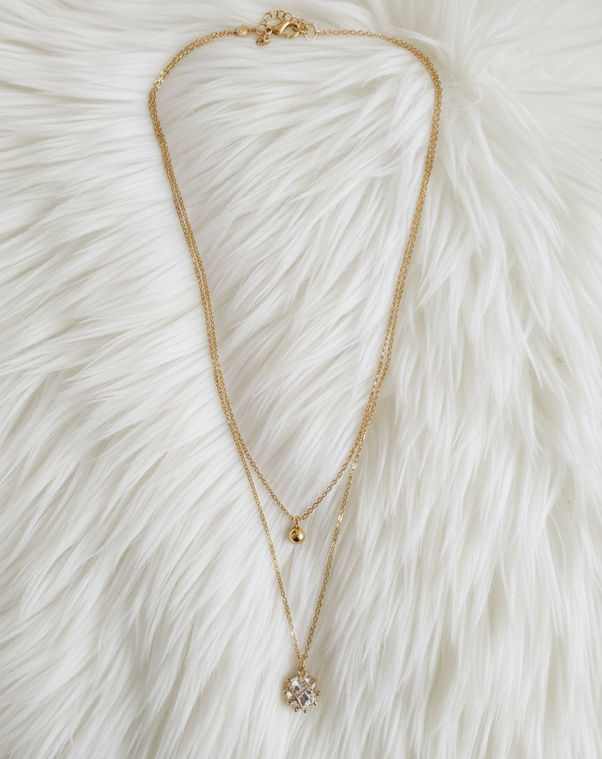This chic double-layered necklace is designed to give you the perfect stacked look with zero fuss. It features two elegant gold-tone chains connected at the clasp for easy wearing. The shorter chain is simple and modern, adorned with a single, smooth gold bead. The longer chain showcases a truly stunning centerpiece: a starburst pendant encrusted with brilliant, clear crystals that sparkle beautifully in the light. This necklace effortlessly blends minimalist style with a touch of glamorous sparkle, making it versatile enough for daily wear or special occasions. It’s an essential accessory for adding instant sophistication and a trendy layered effect to any outfit.