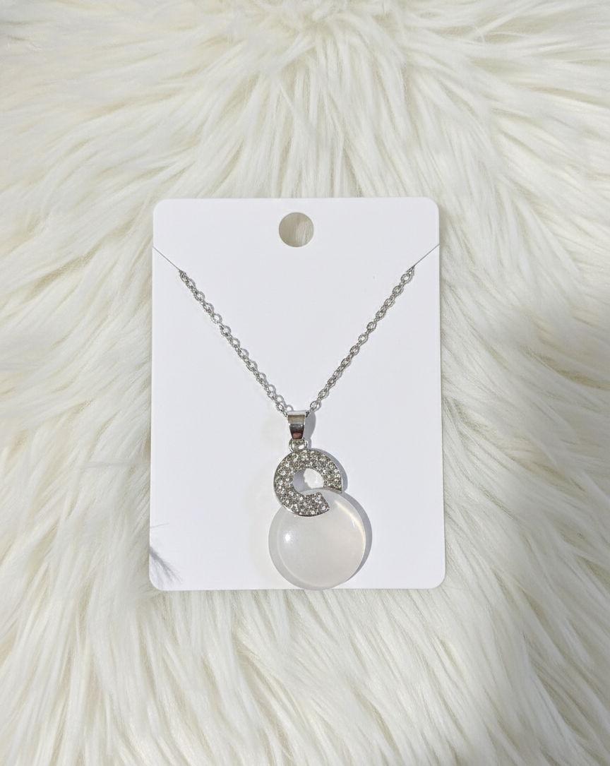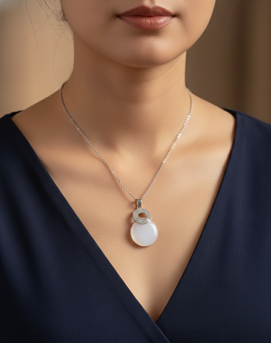 This magnificent necklace is a centerpiece accessory designed for lasting elegance and style. It features a strong, high-quality silver-tone chain that securely holds a striking pendant. The pendant showcases an upper loop segment, expertly set with brilliant, clear crystals for maximum shine and visual appeal. This sparkling component is perfectly paired with a large, smooth, opaque white gemstone that offers a clean, sophisticated polish. The intentional blend of dazzling sparkle and classic white creates a truly captivating look. This piece is a superb addition to any jewelry collection, offering a versatile yet luxurious style that is appropriate for any occasion.