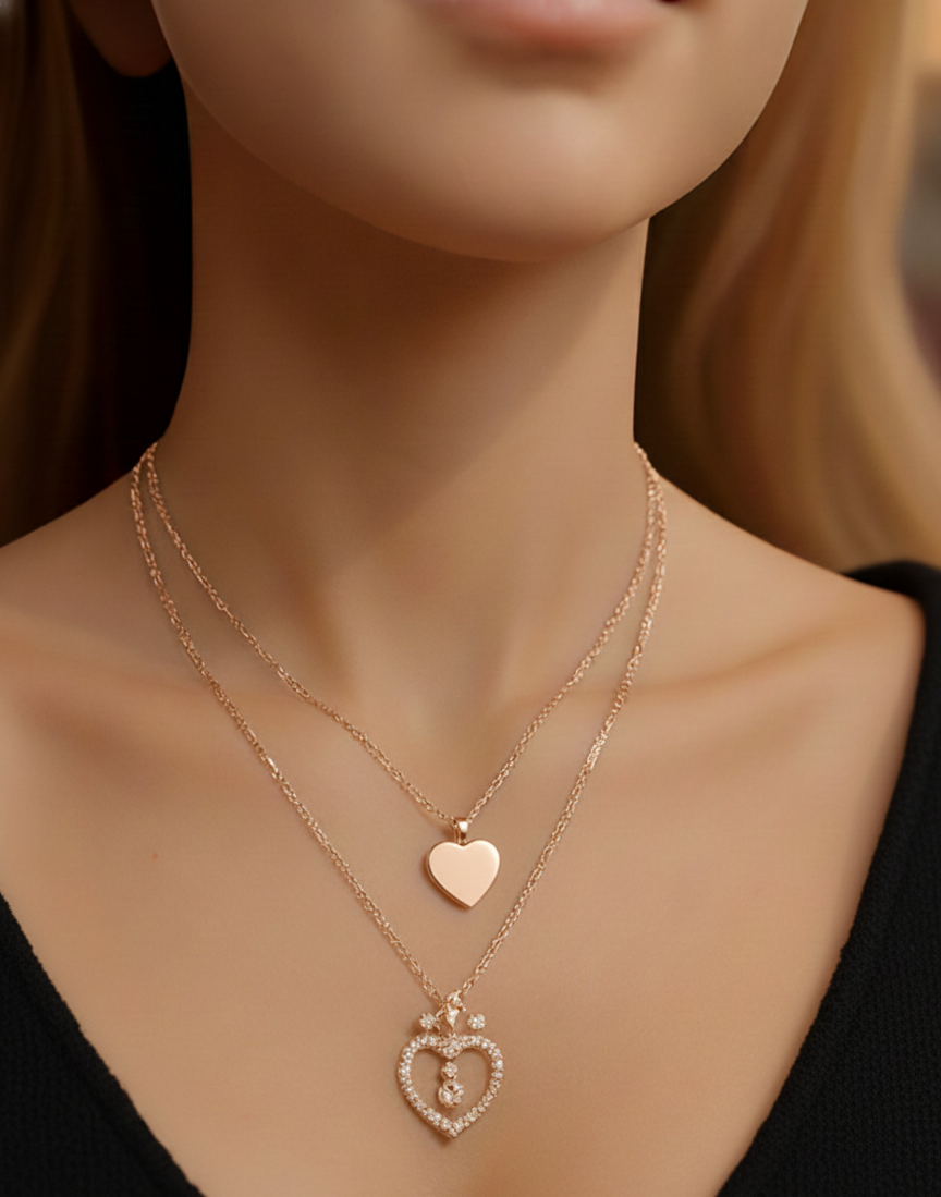 This is a beautiful and stylish layered necklace featuring two distinct pendants on rose-gold tone chains. The top chain holds a sleek, polished, solid heart pendant. The lower, slightly longer chain showcases a magnificent open heart pendant adorned with small details, topped with a charming crown, and featuring a single, brilliant clear gemstone secured in its center. The combination of the simple, shiny heart and the intricate, sparkling crowned heart creates an attractive contrast, making this piece a versatile accessory that is both elegant and eye-catching.