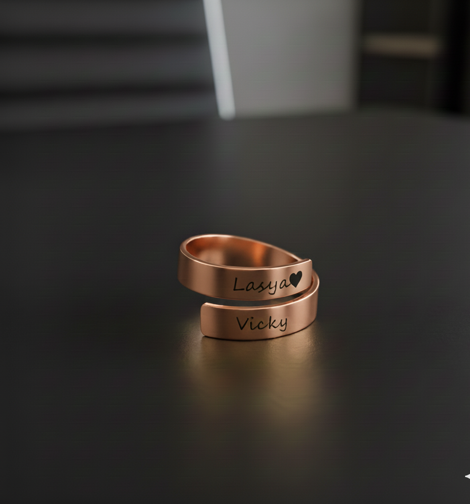 This stunning, adjustable rose gold-tone ring is the perfect symbol of a special connection. Its elegant wrap-around design features two smooth bands that are customized just for you. We can expertly engrave any names or short meaningful words onto the bands. Because of its clever design, this ring is fully adjustable to comfortably fit any finger size. It’s a wonderful, memorable gift for a loved one, or a beautiful way to keep special names close to you every day.