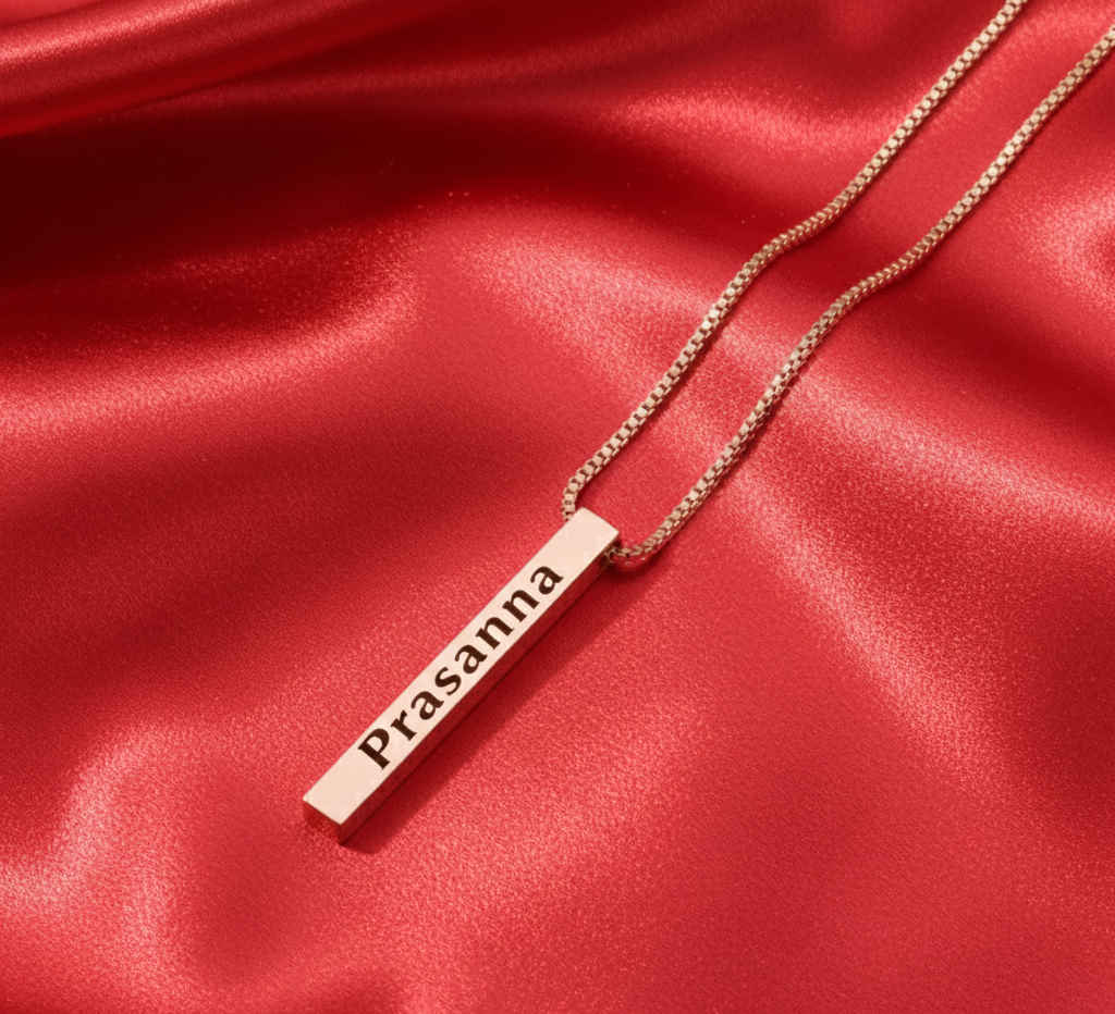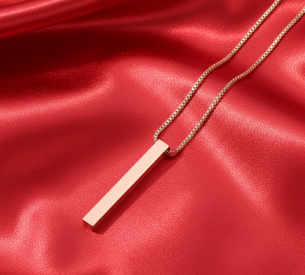 This exquisite necklace features a stunning rose gold rectangular bar pendant that makes a sophisticated statement. The beautiful, warm color of the rose gold offers a modern and romantic look, contrasting perfectly against the vibrant red background. The bar’s clean, smooth surfaces are specially designed for personalization, allowing you to add meaningful details like a name (as shown in the image), initials, a significant date, or a heartfelt word. This strong, stylish accessory is suspended from a matching, classic chain. By adding your own custom engraving, you transform this chic pendant into a cherished, one-of-a-kind keepsake, perfect for celebrating love or marking a special memory.