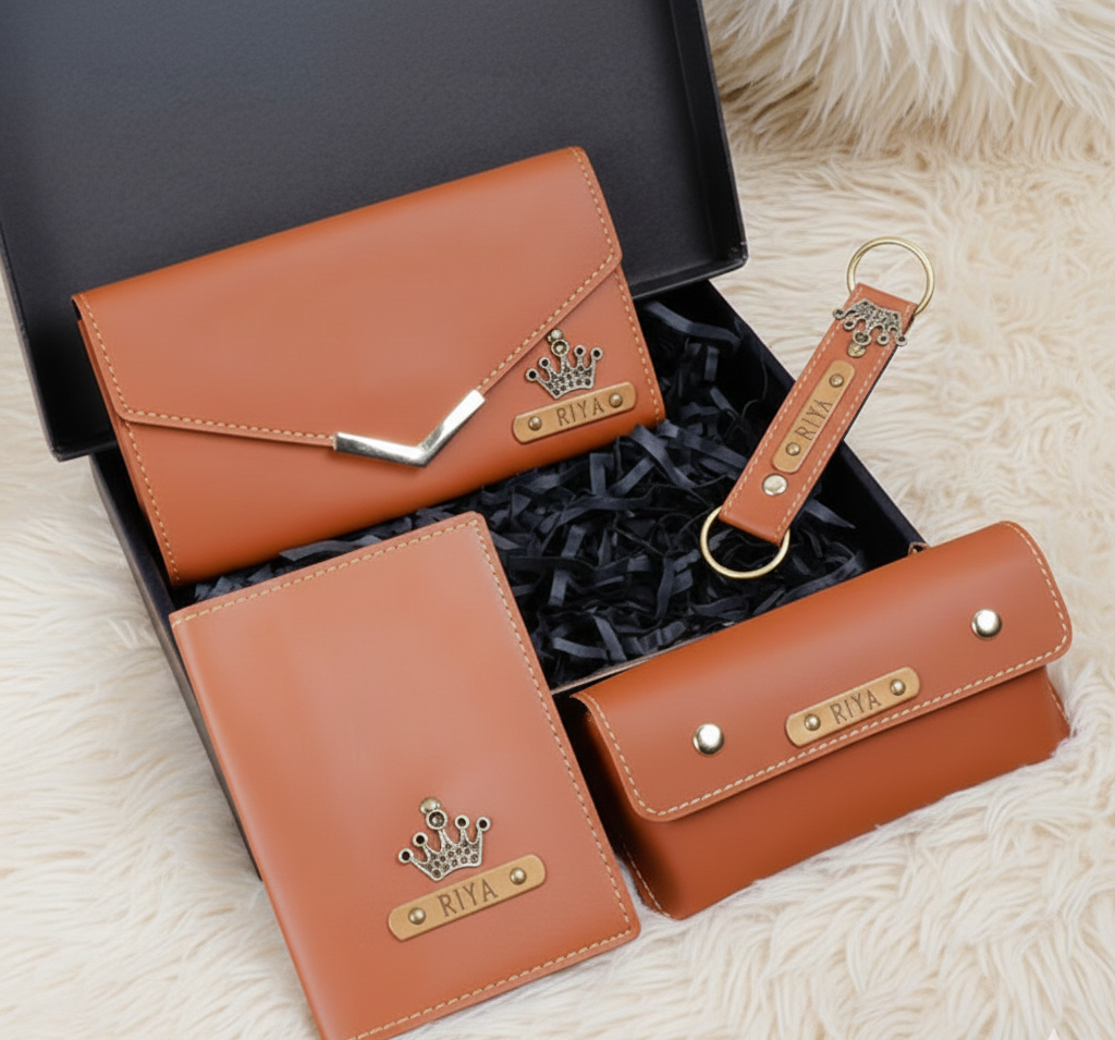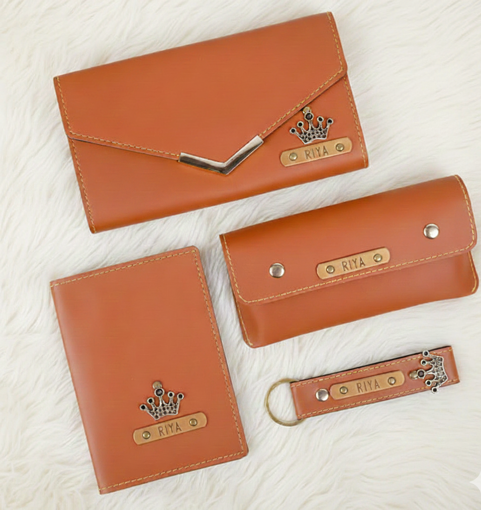 Travel in style with a touch of YOU using this Personalized Travel Essentials Hamper, designed for the modern woman who loves elegance and organization. Crafted from tan premium PU leather, it includes a passport cover measuring 14 cm x 10 cm that fits one passport, a wallet for currency and cards, a keychain, and an eyewear case. Each piece is customized with your name and favourite charm, making it truly unique. A perfect self-indulgence or a thoughtful gift for a travel lover. Personalize each item with your name and favourite charm, the eyewear case doesn’t come with a charm.