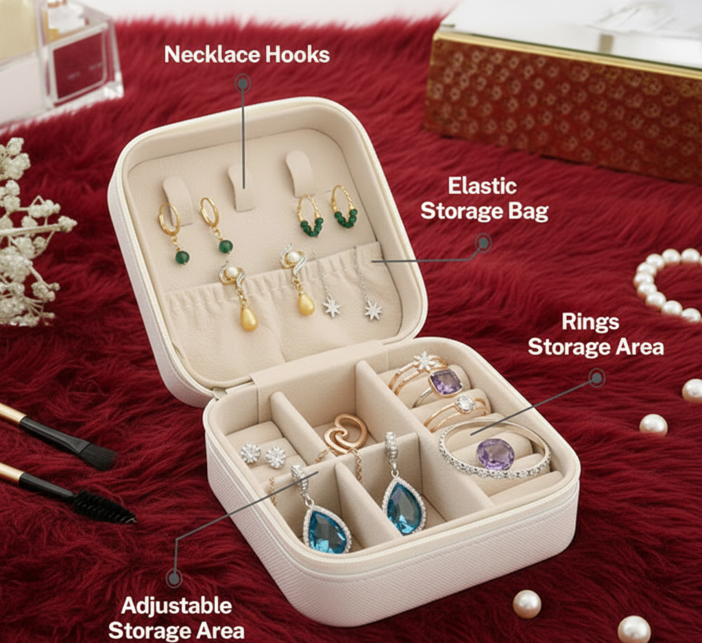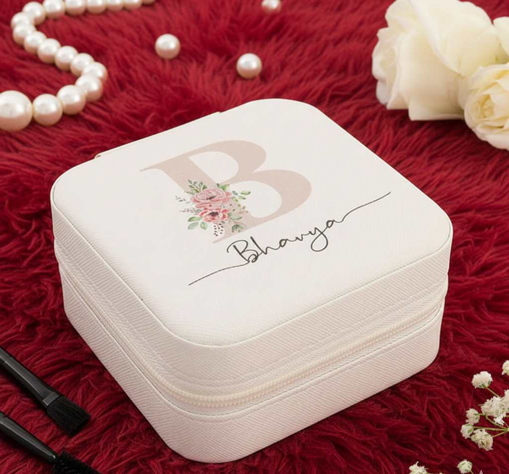 A portable and sleek organizer for all your jewellery needs. Crafted from high-quality PU leather, this lightweight and easy-to-carry jewellery organizer is a must-have for all your travels. It has three hooks and an elastic pocket to store your chains and earrings. The bottom part has two adjustable section dividers and ring holders. The box is secured with a zip closure to protect your jewellery from external damage. Since the box is compact, it can easily fit in your backpack or sling bag. Personalize the box with your initial and name, giving it a unique touch.